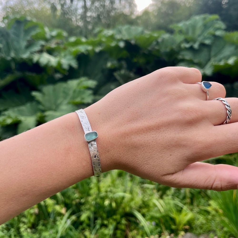 6mm thick bangle uniquely textured by naturally found rock surfaces, with sky blue seaglass