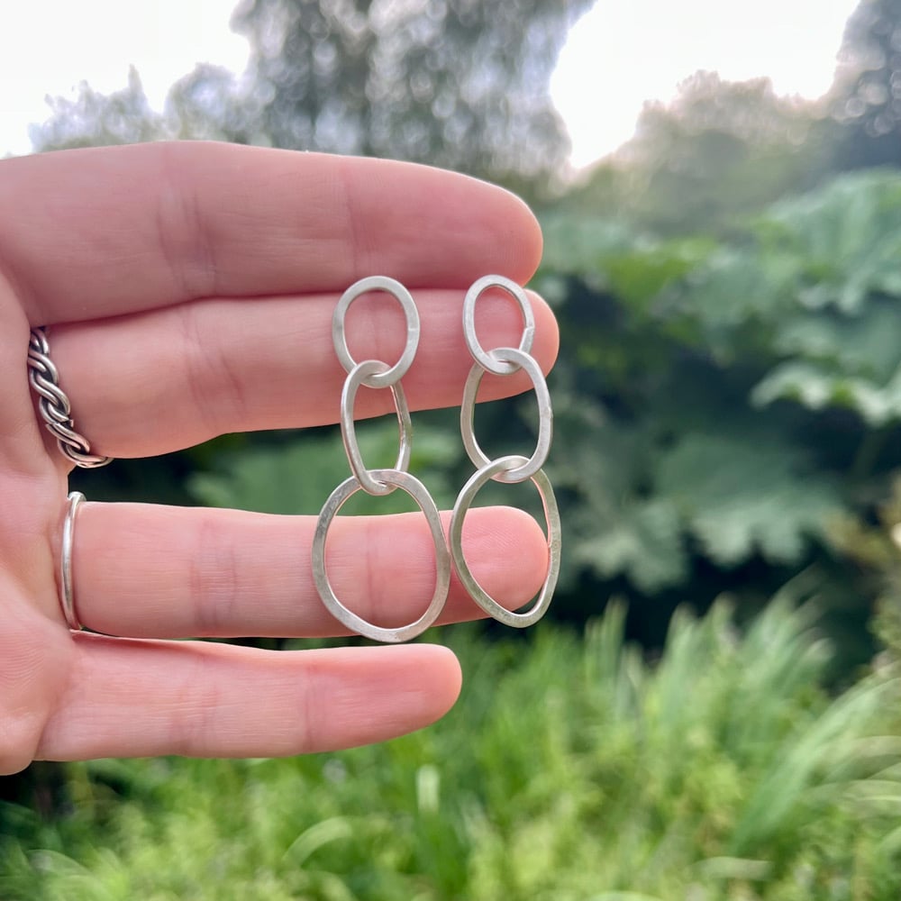 Rustic sterling silver hoops linked and stacked to form gorgeous drop stud earrings Drop length: 45mm