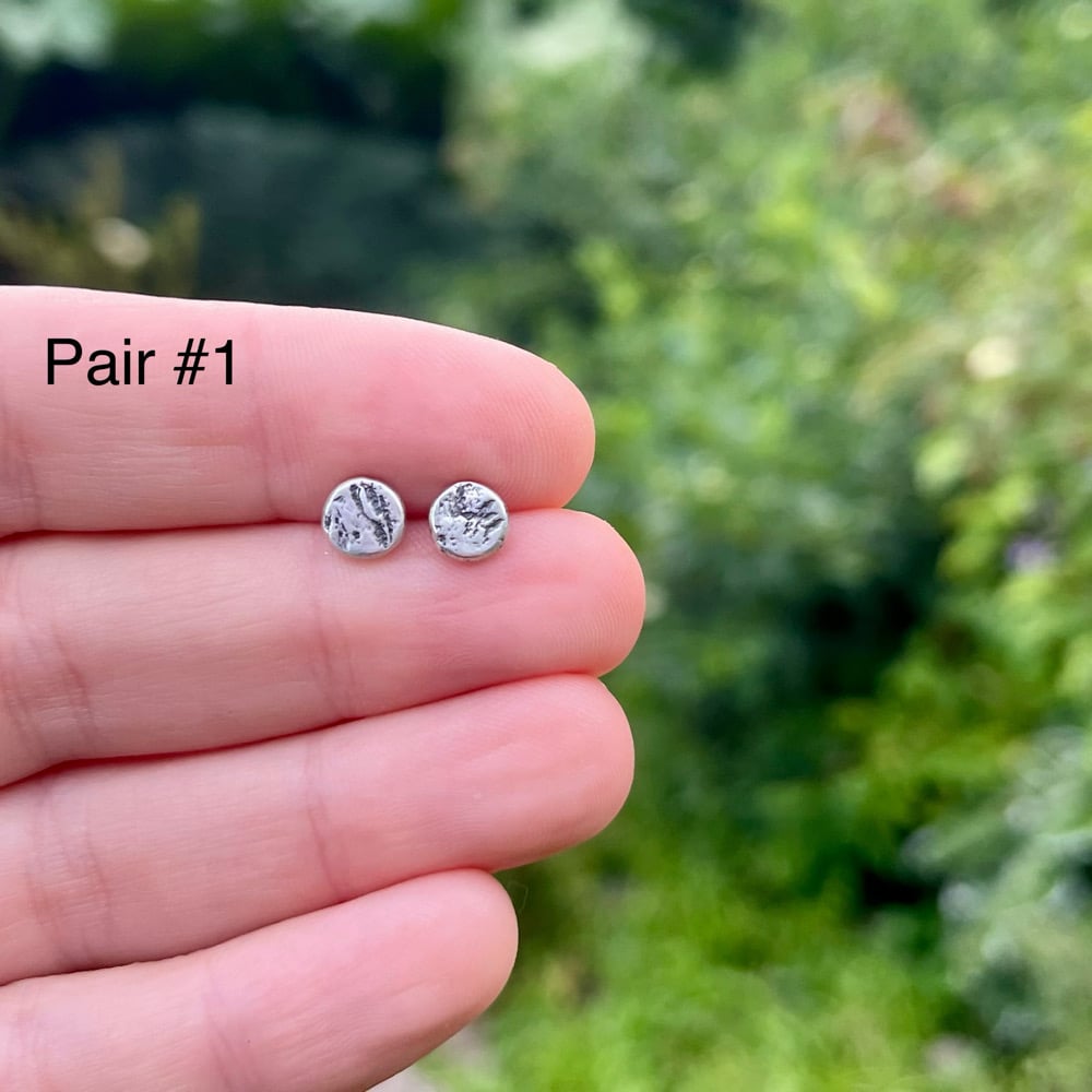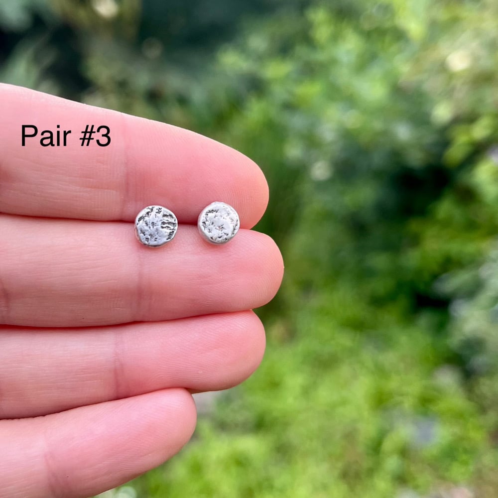 Sterling silver studs organically textured. Each stud is unique and resembles the cratered surface of the moon. Approx. 7/8mm diameter