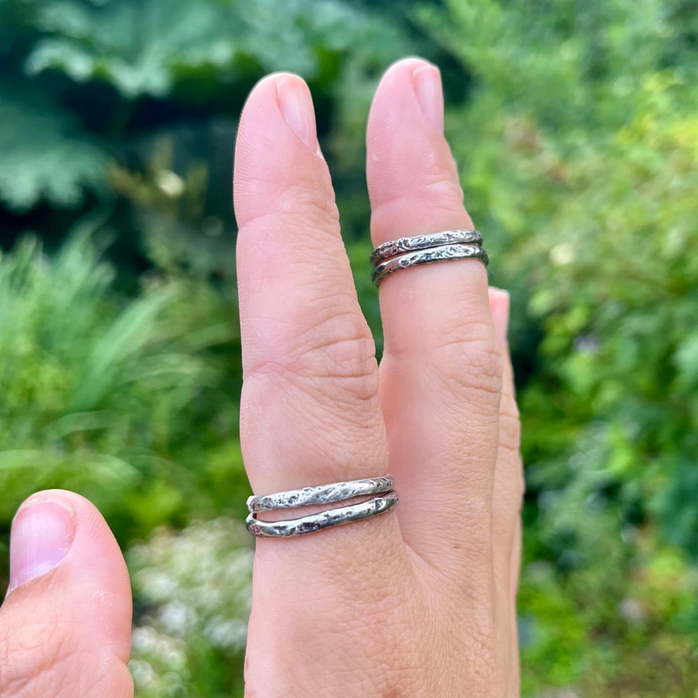 Sterling silver, organic shaped rings; meaning they have a little bit of wibble wobble to them! Each one is unique to the rock it was textured against on our walks through the countryside. The shape is raw and naturally occurring, as if the ring is a little piece of found buried treasure.