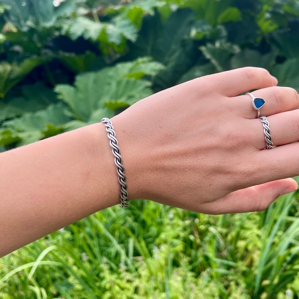 A hand woven sterling silver bangle in a pattern that resembles rolling waves